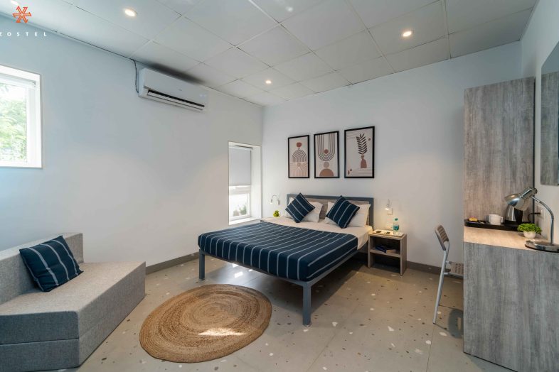 Deluxe Private Room (ensuite) By, Zostel Hospitality November 4, 2025 9 A spacious ensuite room with a double bed, a worktable, a wardrobe, a TV, and AC.
